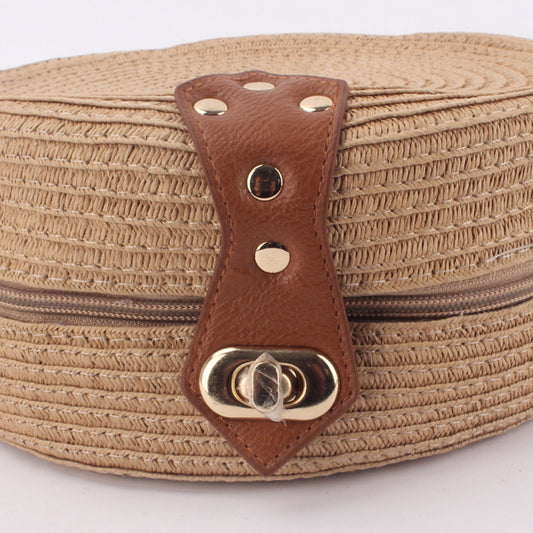 NiftyPlaza Round Shoulder Bag Leather Straps Beige Color Classic and Women Fashion Summer Beach Bag