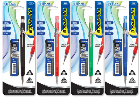 BAZIC Mechanical Pencil 0.7mm Triangle Soft Grip, Refill 2B Ceramic Lead, Latex Free Eraser - Random Color