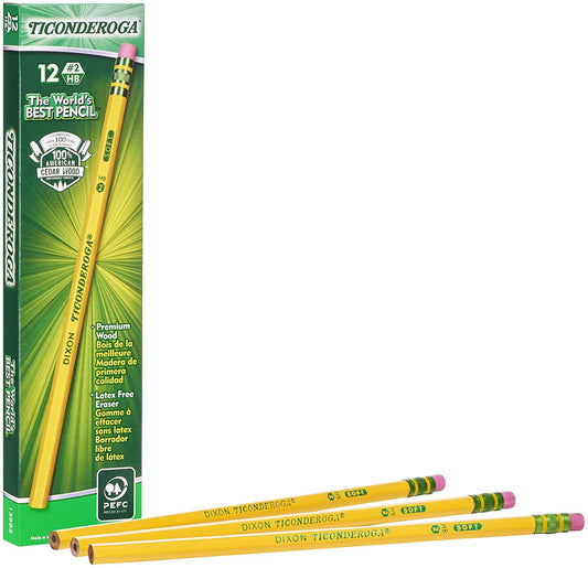 12 pcs Ticonderoga Pencils, Wood-Cased Graphite Yellow #2 HB Soft latex-free eraser