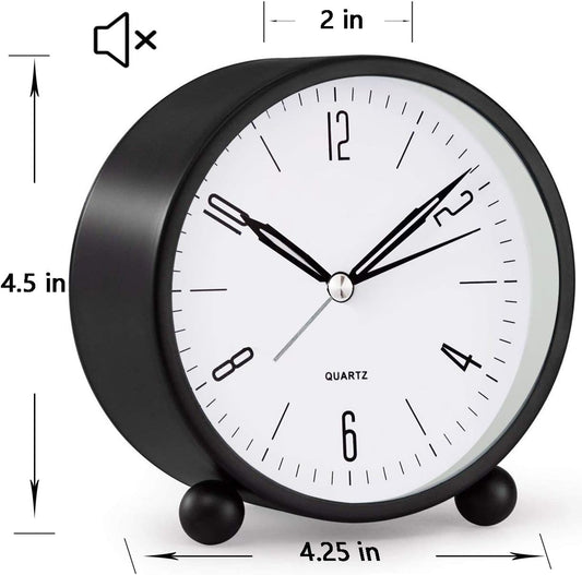 Analog Alarm Clock, 4 Inch Round Non Ticking, Battery Operated, Light Function, Desk/Bedroom