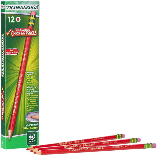 Ticonderoga Erasable Checking Pencils with Eraser, Pre-sharpened, 2.6 mm, 2B (#1), Carmine Red Lead Dozen