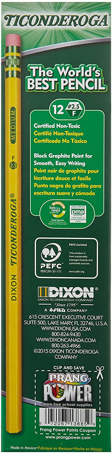 Ticonderoga Cedar Yellow Wood Pencils, 2-1/2/F Medium Lead, Dozen