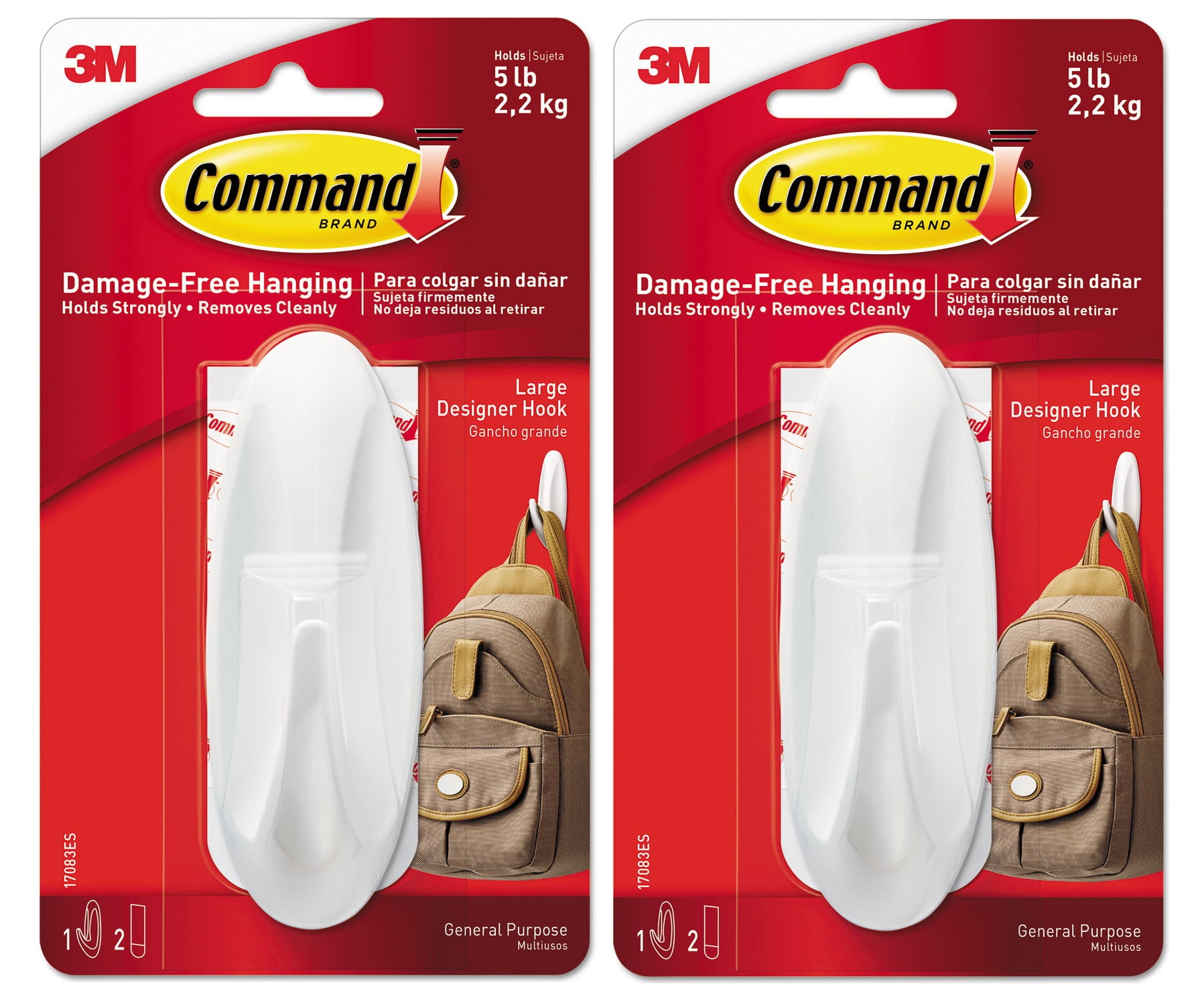 Command General Purpose Hooks, Large, 5 lb Cap, White, 2 Hooks and 4 Strips